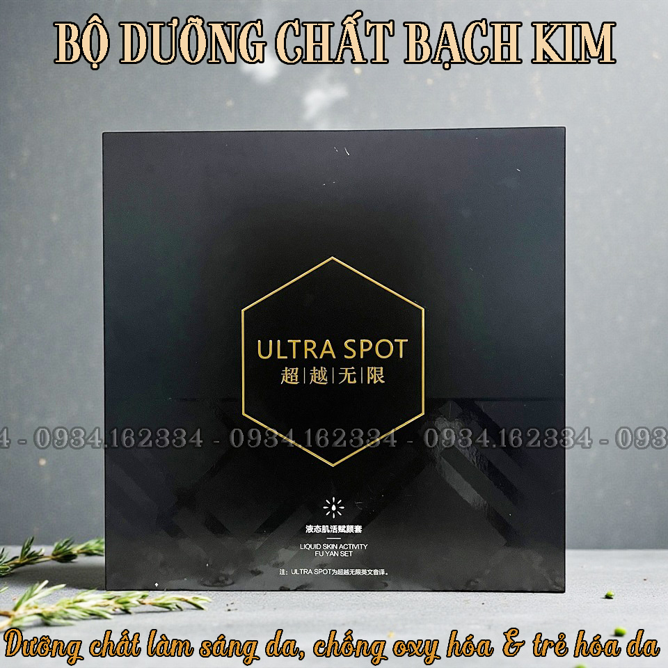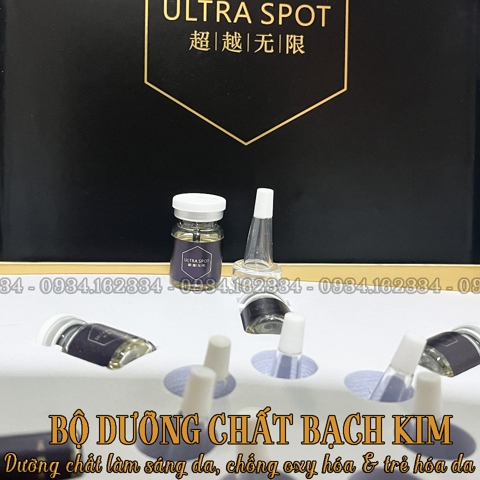 BỘ DƯỠNG CHẤT BẠCH KIM ULTRA SPOT Giải pháp nâng tầm làn da cao cấp – phục hồi & trẻ hóa chuyên sâu - Set gồm 07 chai * 5ml - Sản phẩm của Ultra Spot & Mộc Liên Hoa - Mã vạch sản phẩm: Giá lẻ: 2.600.000 đồng/Hộp Để được ưu đãi tốt hoặc liên hệ mua sỉ hotline 0934.162334 DƯỠNG CHẤT BẠCH KIM mang đến hiệu quả NHANH – RÕ – AN TOÀN cho làn da đang cần cải thiện cấp tốc. CÔNG DỤNG NỔI BẬT Làm sáng da tức thì, da căng bóng rõ rệt Cải thiện da xỉn màu – mệt mỏi – thiếu sức sống Phục hồi & nuôi dưỡng làn da khỏe từ sâu bên trong Hỗ trợ trẻ hóa – nâng tông – đều màu da ƯU ĐIỂM VƯỢT TRỘI Kết cấu tinh chất cao cấp – thẩm thấu nhanh Phù hợp mọi loại da, kể cả da yếu Kết hợp hoàn hảo với các liệu trình công nghệ cao (Meso – Phi kim – chăm sóc chuyên sâu) Làn da đẹp là làn da sáng khỏe từ bên trong – không chỉ là hiệu ứng bên ngoài.