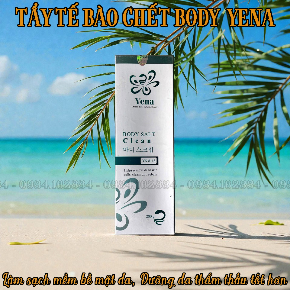 TẨY TẾ BÀO CHẾT BODY YENA Body Salt Clean - Trọng lượng: 200gr - Sản phẩm của thương hiệu Yena (Công Nghệ Hàn Quốc) - Mã sản phẩm: YN8113 - Mã vạch: 8938553919185 Giá lẻ: 290.000 đồng/Tuýp Để được ưu đãi giá tốt hoặc mua sỉ vui lòng liên hệ Zalo 0934.162334 Làn da sần sùi, xỉn màu, thoa dưỡng mãi không thấm? Nguyên nhân có thể do lớp tế bào chết tích tụ lâu ngày.